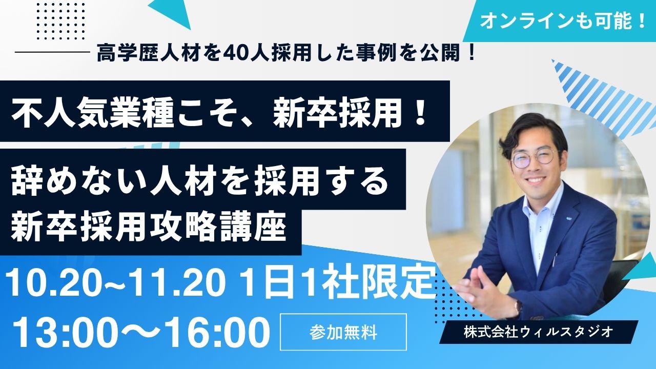 人材難で苦労する会社様。今こそ、新卒採用を!不人気業種の不動産営業で、給与・休日関係なく高学歴人材を40人以上採用する、株式会社ウィルの採用ノウハウを一挙公開。