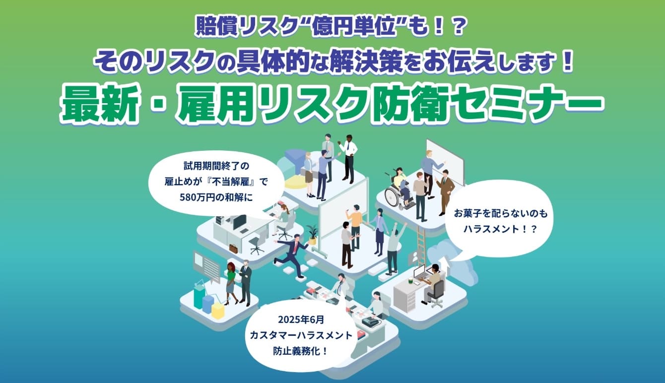 賠償リスク"億単位”も!? そのリスクの具体的な解決策をお伝えします! 2025年最新の経営リスクについて学ぶ! ---本セミナーを通じて、最新の法改正のポイントを学び、実際のトラブル事例からリスク回避策を習得し、保険などリスクファイナンスの最新情報を手に入れましょう。---