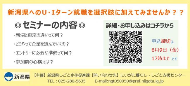 新潟県へのU・Iターン就職を選択肢に加えてみませんか?? U・Iターン就職のメリットや、新潟県内企業の選び方、参加前の心構えなどインターンシップに向けた準備についてお伝えします。 相談員と気軽にお話ししながら、にいがた就活について考えてみましょう!