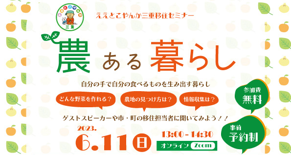広い畑で野菜作りをしたい! 家族の食べる野菜を自分の手で作りたい! でも畑の見つけ方は? どんな方法で家庭菜園はできるのだろう? 家庭菜園や三重県について知りたい方にオススメのセミナーです。 三重県で暮らし、農業を楽しんでいる方や、津市・名張市・南伊勢町の移住担当者にそれぞれの地域の魅力・農業の特徴などを聞いてみましょう。